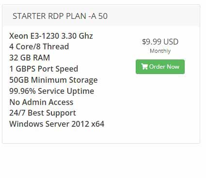 Xeon E3-1230 3.30 Ghz 4 Core/8 Thread 32 GB RAM 1 GBPS Port Speed 50GB Minimum Storage 99.96% Service Uptime No Admin Access 24/7 Best Support Windows Server 2012 x64